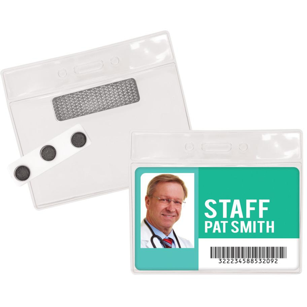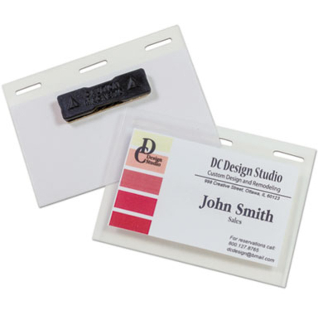 Create your own laminated ID cards, employee badges and security passes. Simply peel, insert paper or business card and seal. Insert cannot exceed 2-1/4" x 3-1/2". The easy-snap and connector strap easily attaches to any lanyard or reel. Vertical badge measures 2-5/8" x 4-1/4".