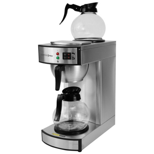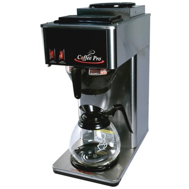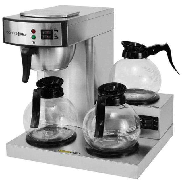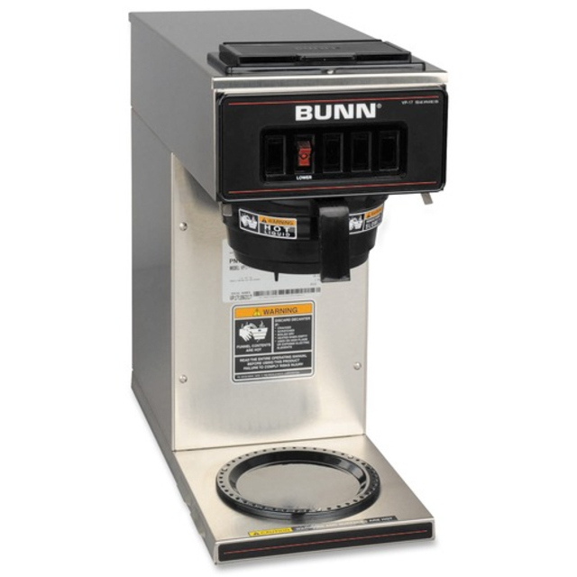 -Internal components are constructed from stainless steel. -Pourover brewer requires no plumbing – completely portable. -Just pour cold water in top and coffee brews immediately. -Two separately controlled warmers. -Integral part of any office coffee service program. -Brew into decanters. -SplashGard funnel deflects hot liquids away from the hand.