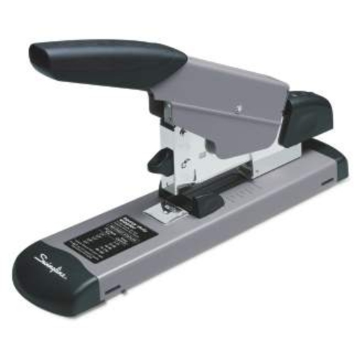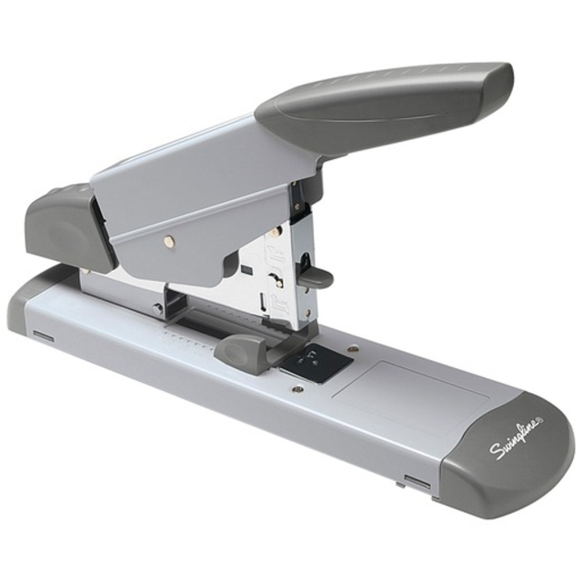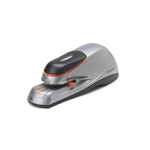 Electric Flat Clinch Stapler uses standard-size staples to fasten up to 20 sheets of 20 lb. paper. Patented jam-free design features overheat protection and low-staple indicator. Simple button releases the staple magazine. Stapler runs on 110 Volts or six AA batteries (sold separately). Power cord is about 6' or 1.8 meter.