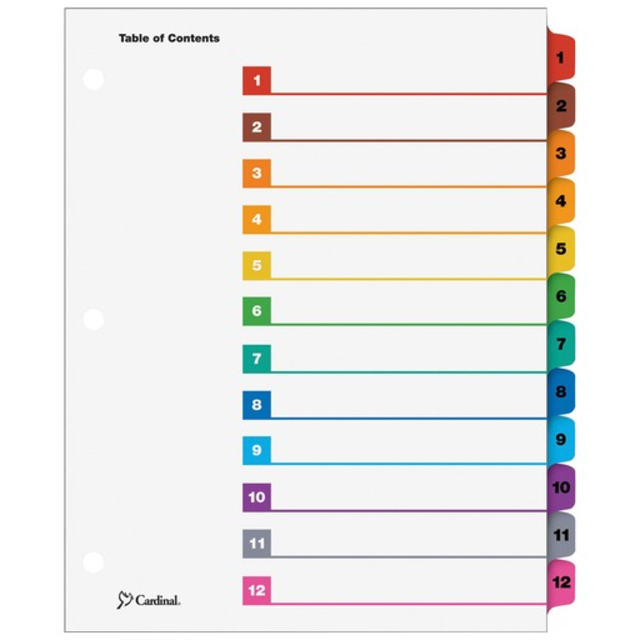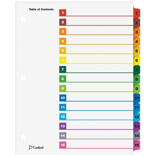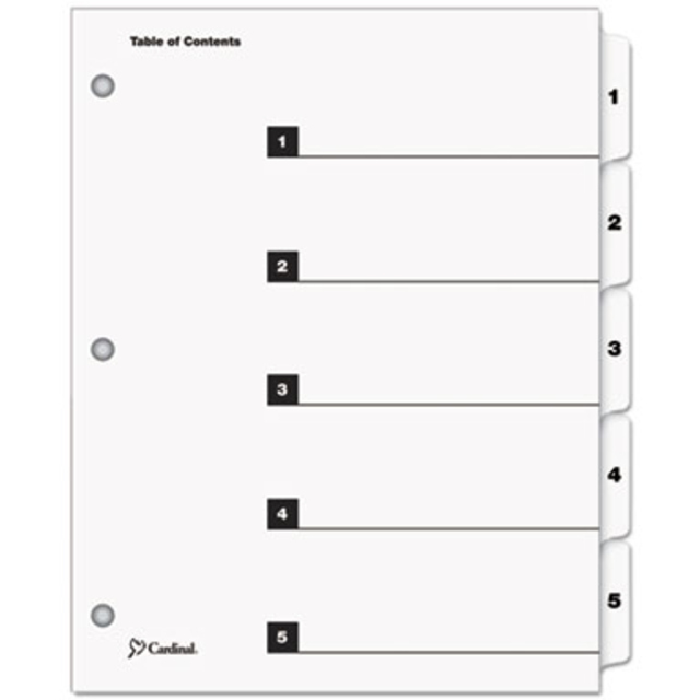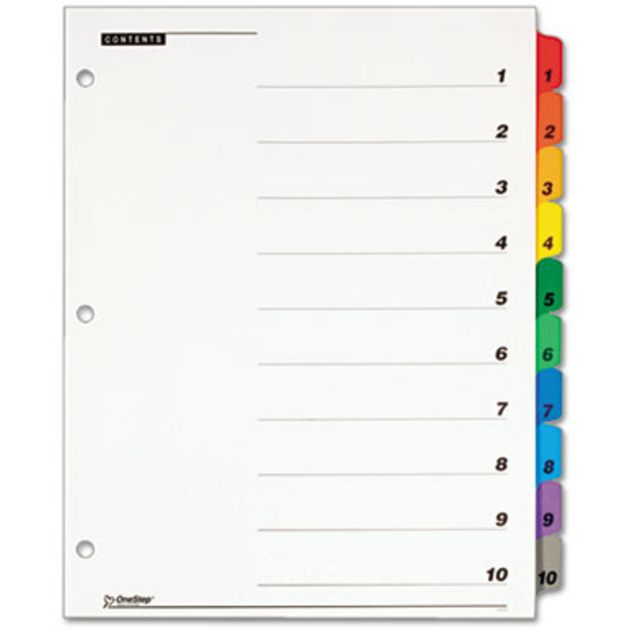 OneStep Index System instantly creates custom index sets by printing onto the included Table of Contents sheets. Matching, preprinted tabs on the divider sheets can be used in either portrait or landscape formats. Multicolored tab sets have coordinating, multicolor, Table of Contents sheets. Easy-to-use, free templates in your favorite software are available online. Tabs and ring edges are reinforced to withstand heavy use. Three-hole punched indexes are compatible with laser or inkjet printers, as well as standard typewriters. Tabs are labeled from A to Z for alphabetical indexing.