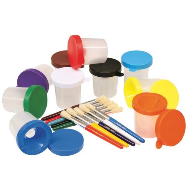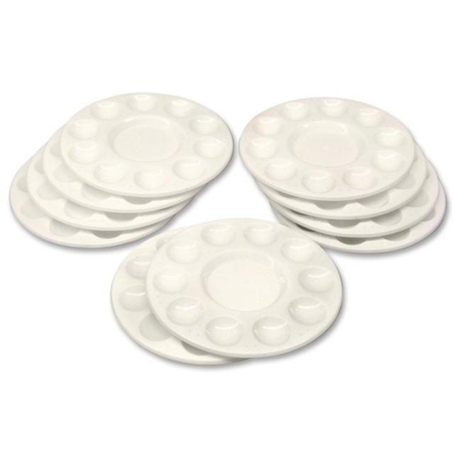 Palette-shaped paint trays conveniently hold and organize a variety of colors in 10 paint wells. Durable plastic features a smooth finish that's easy to clean. Convenient thumb hole lets children hold the tray just like a professional.