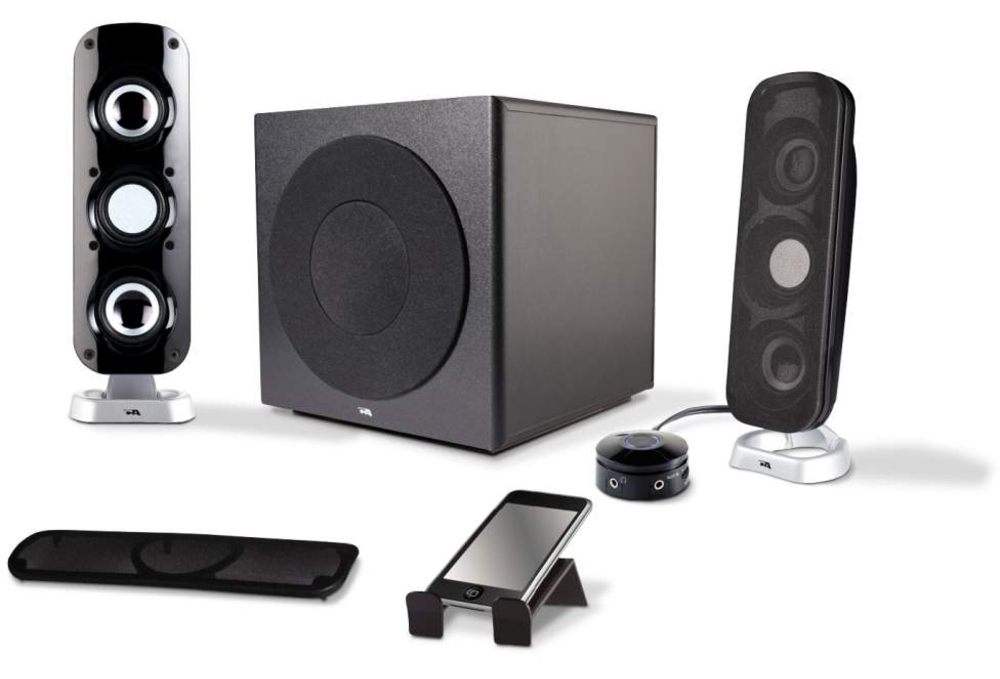 Bombastic and in your face, the CA-3810 is a 2.1 computer speaker system that brings your ear to submission with its thunderous bass performance. Housed in an acoustically balanced wood cabinet, the CA-3810’s subwoofer instills a solid, deep audible experience no matter what you’re listening to. The separate control pod turns the speaker system on and o, while sporting an LED power indicator. The pod also allows volume levels for the satellites and bass control for the subwoofer to be adjusted with the swipe of a nger. The pod also houses a convenient headphone jack and auxiliary input for easy access. Use the handy mp3 player cradle to safely place your mp3 player, iPhone, or iPod when connected. - Convenient desktop control pod: - On/off switch - Master volume - Bass volume - Headphone output jack - Aux in - Illuminated power on indicator - Magnetically shielded satellite speakers - Removable grilles - MP3 cradle included
