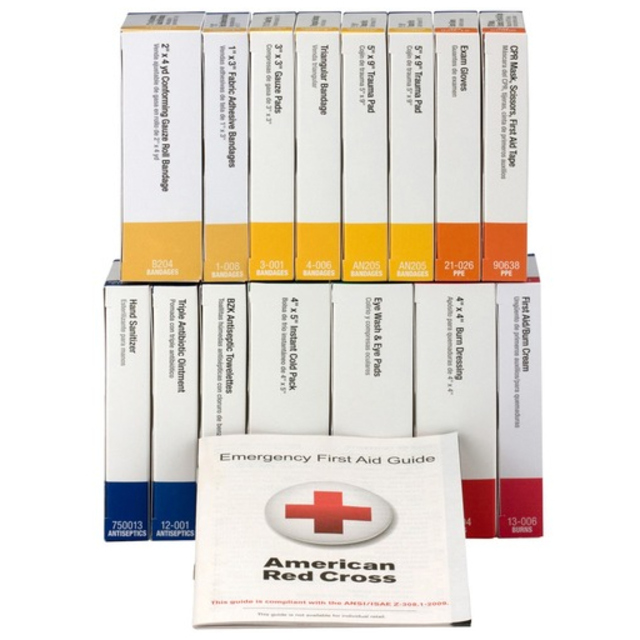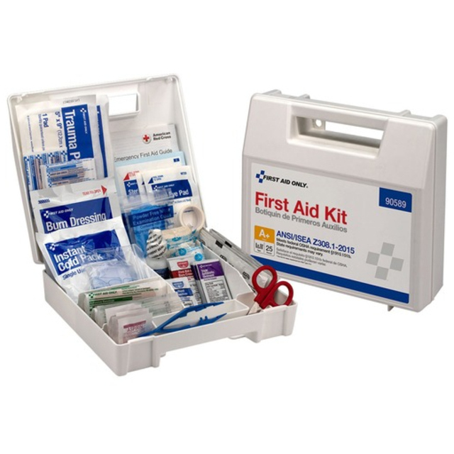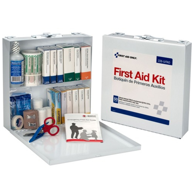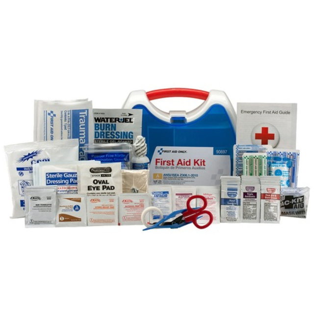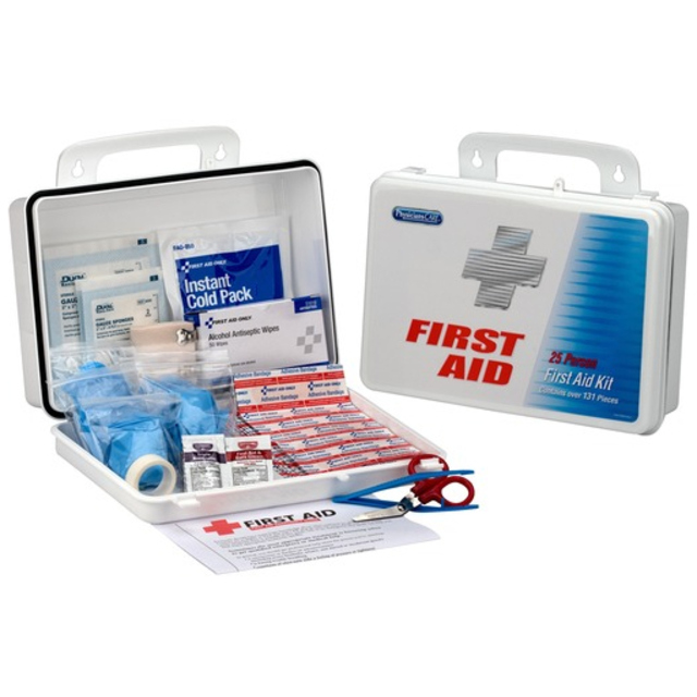 Sturdy kit with plenty of first aid supplies needed for medical emergencies. Durable weatherproof case. Comes with a carrying handle. Kit is wall mountable. Contents are sufficient to treat 25 or more people. System Capacity: 50 Person System; Number of Pieces: 210; Contains: 1\" x 3\" Plastic Bandage; 1/2\" x 5 yd Bulk Tape; 2\" x 2\" Gauze Pads; 2' x 5 yd Gauze; 3 x 3 Gauze Pads; 5 x 9 Dressing Bulk; Alcohol Wipes; Antacids; Aspirin; BZK Wipes; Burn Dressing Gel; Butterfly Closure; CPR Mask; Cold Pack; Cotton Tip Applicator; Extra Strength Non Aspirin; Eyewash; First Aid Burn Cream; First Aid Guide; Forceps; Hand Sanitizer; Insect Sting Relief Pads; Jr Strips; Nitrile Gloves; Shears; Sterile Eye Pads; Tongue Depressor; Tourniquet; Triangular Bandage; Triple Antibiotic; Case Material: Plastic.
