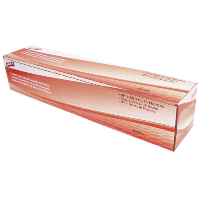 Extra heavy-duty aluminum foil is super-sturdy and strong enough to handle any of your food needs. It is great for baking, freezing or wrapping. Tough and durable with standard cutting edge. Material(s): Aluminum Foil; Length: 500 ft; Width: 18\"; Packing Type: Box.
