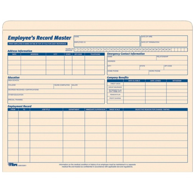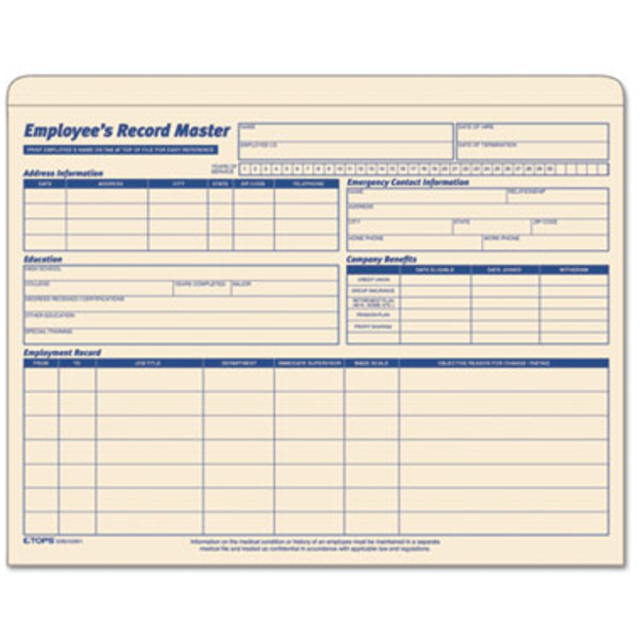 Effectively organize all pertinent personnel documents for each employee. Record and update employment history on the preprinted front side. Holds pre- and post-hiring forms. Closed sides. 10 pt. Manila. Provides space for company benefits, education details and employment records. Sleeve & Jacket Type: File Jacket-Top Tab; Material(s): 10 Pt. Manila; Height: 9 1/2\"; Width: 11 3/4\".
