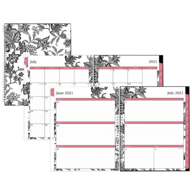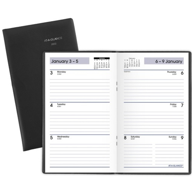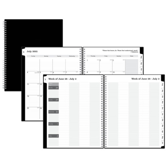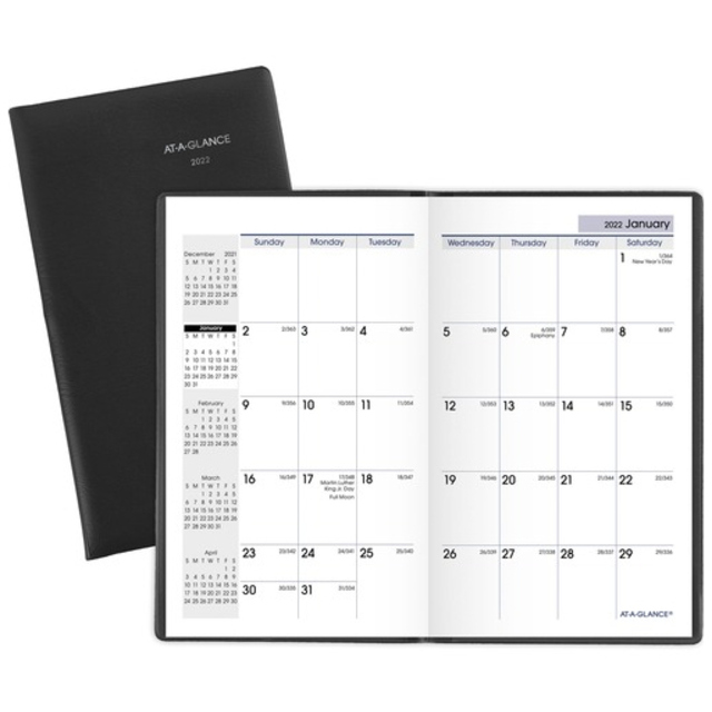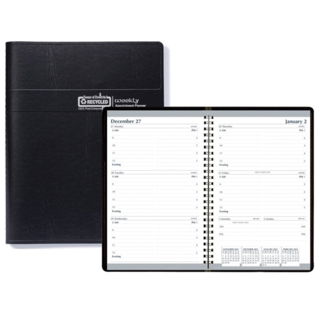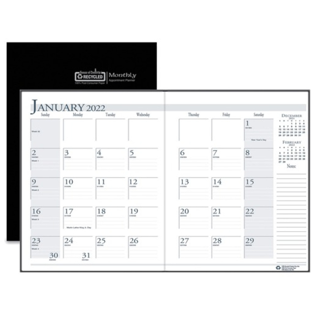 Monthly planner features a stitched, black leatherette cover to protect your planning. Planning pages range 14 months from December to January. Two-page-per-month spreads include large, unruled daily blocks (1-1/2" x 1-1/4"); holidays; count of days/days remaining; Sunday-through-Saturday scheduling; a ruled notes area along the side; and past and future months reference near the top right corner. Nonrefillable planner contains paper made with a high percentage of recycled material.