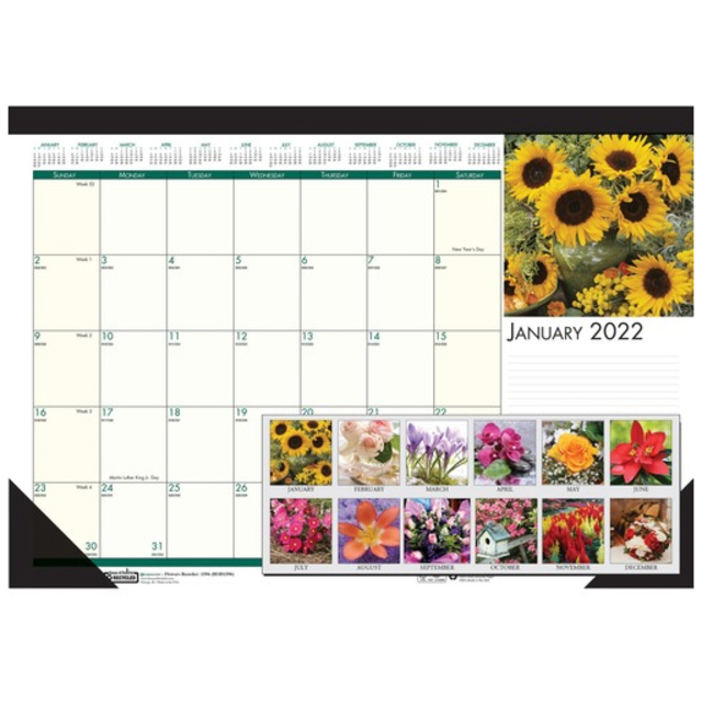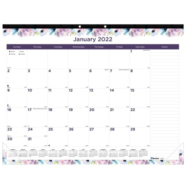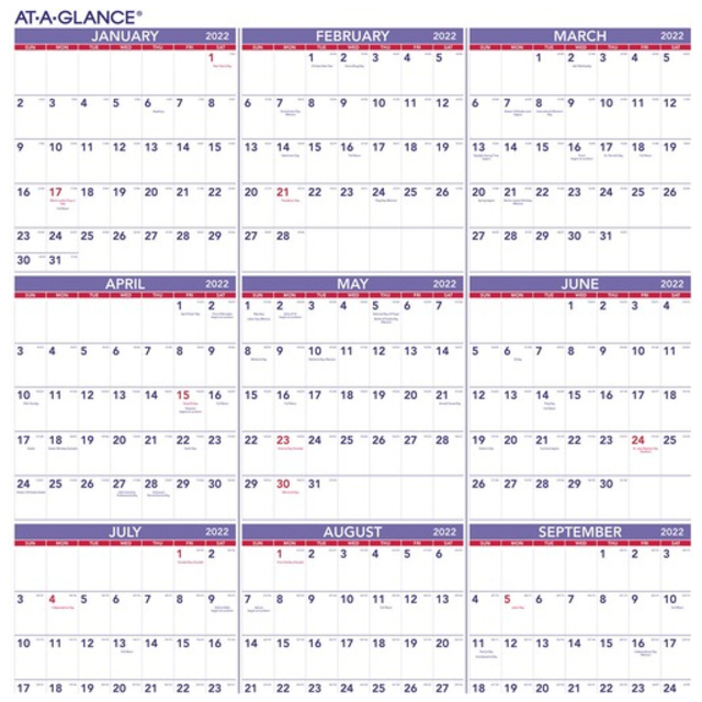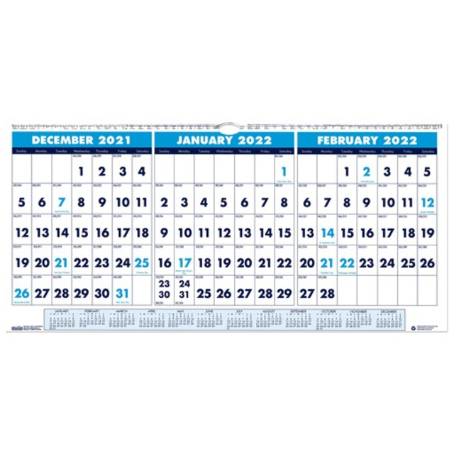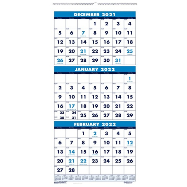Three-month wall calendar is the perfect size for cubicle areas. Design is vertical and compact so you can hang it in space-limited areas. Large numbers can be seen from a distance. Dated planning pages range 14 months from June to July. Each page features three months in equal size - previous, current and future. This one-page-per-three-month format includes two-color printing, unruled daily blocks (1-1/6" x 1"), holidays highlighted in blue, Sunday-through-Saturday scheduling, and a full-year reference calendar at the bottom. Nonrefillable calendar features wire binding with a hanger. Wire binding and calendar pages contain a high percentage of post-consumer recycled material.