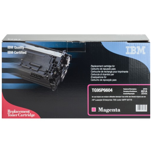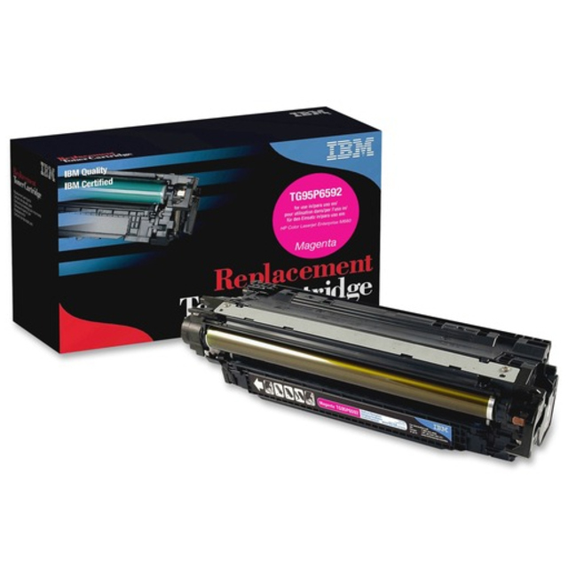 Toner cartridge is designed for use with HP Color LaserJet M651n, M651dn and M651xh. High-quality alternative is IBM Certified Quality. Remanufactured cartridge offers OEM-equivalent image quality and page yield (approximately 15,000 pages).