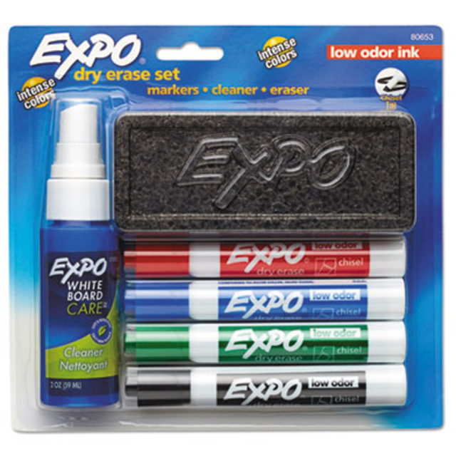 Two chisel tip colors in one dry erase marker. Use EXPO® colors to track, schedule and present. Low-odor ink. For use on whiteboards, glass and most non-porous surfaces. Marker Type: Dry Erase Markers; Assortment: Blue/Black; Green/Black; Purple/Black; Red/Black; Color(s): Assorted; Tip Type: Chisel.