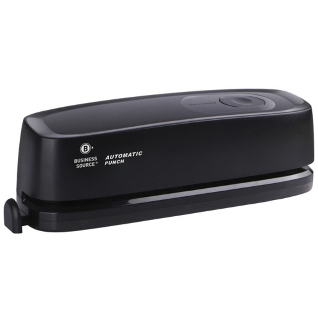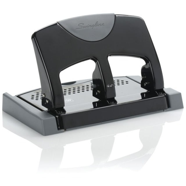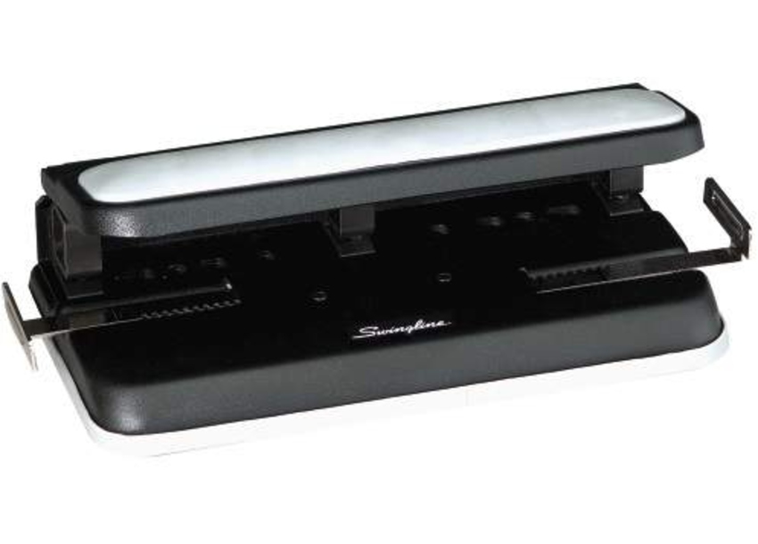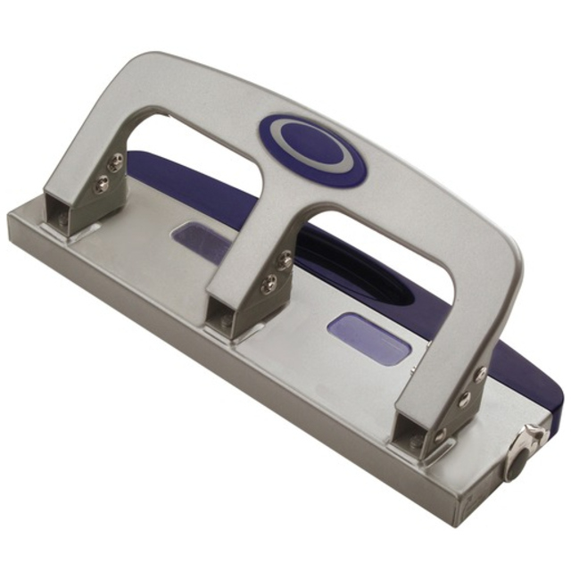 Heavy-duty, three-hole punch with padded handle punches three 9/32" holes in up to 40 sheets of 20 lb. paper. Lockdown handle allows easy storage. Padded handle provides comfortable operation. Chip tray is easy to empty. Hole punch also features an adjustable paper guide, sturdy metal construction and jam-free mechanism.