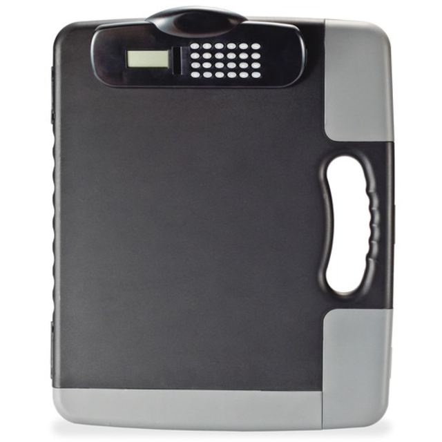Ringbinder Clipboard Storage Box provides convenient portable storage for three-hole punched papers (A4/letter-size) and writing instruments. Built-in, three-ring binder offers a 1" capacity in the metal rings. Design includes a pens/pencils holder and business card pocket. Strong, nickel-plated, steel spring clip on the exterior holds papers securely. Case is made of durable plastic.