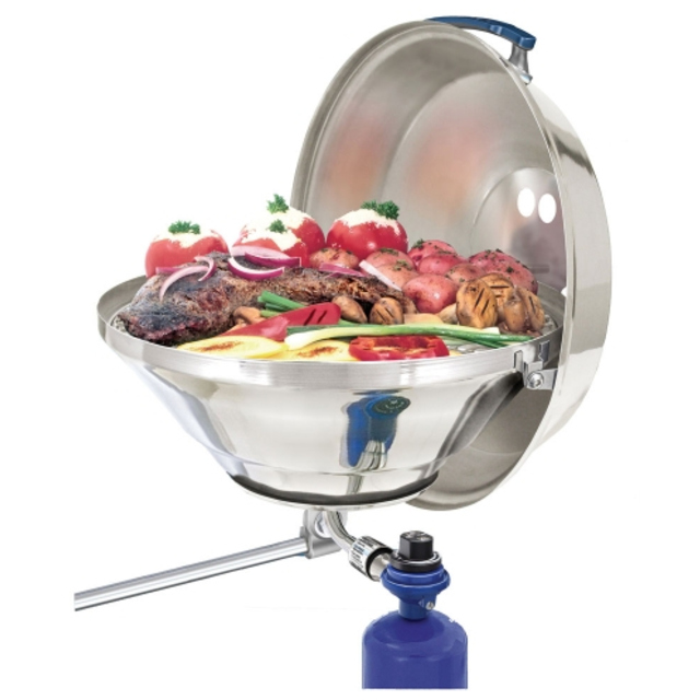 The Camco Olympian 5500 Premium Stainless-Steel Portable RV Gas Grill is designed for RV and outdoor use and is easy to transport. This high quality lightweight 304 stainless-steel barbecue has a large cooking area of 180 square inches. Its cast iron smoker plate is designed to offer the fullest flavor while minimizing grease fires. The stainless-steel burner heats up faster, is easier to clean, and resists rust. The grill is ready to use straight from the box, only assembly required is the mount to hang the grill on the RV mounting rail. It includes a quick-connect hose and valve to use the low-pressure propane supply on an RV or trailer that has a built-in low pressure quick-connect propane connection. The Camco Quick-Connect x ACME Propane Hose (57629) or Quick-Connect x Throwaway Propane Hose (57628) must be purchased separately to use the grill with a 20 lb. propane cylinder or 1 lb. throwaway propane cylinder.Weighs approximately 26 lb.
