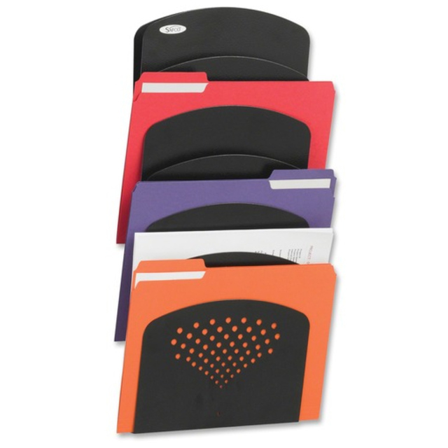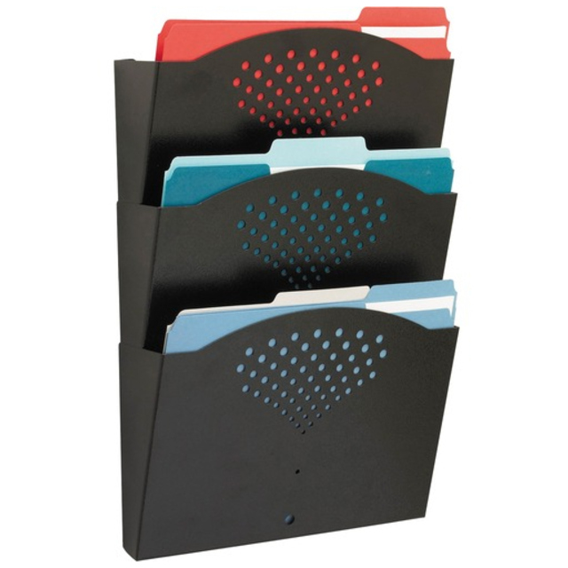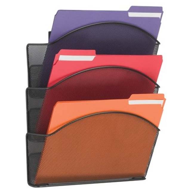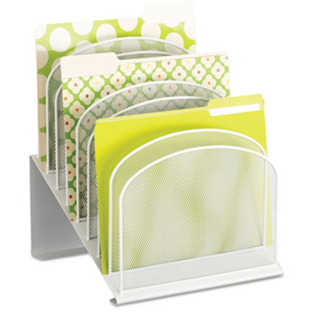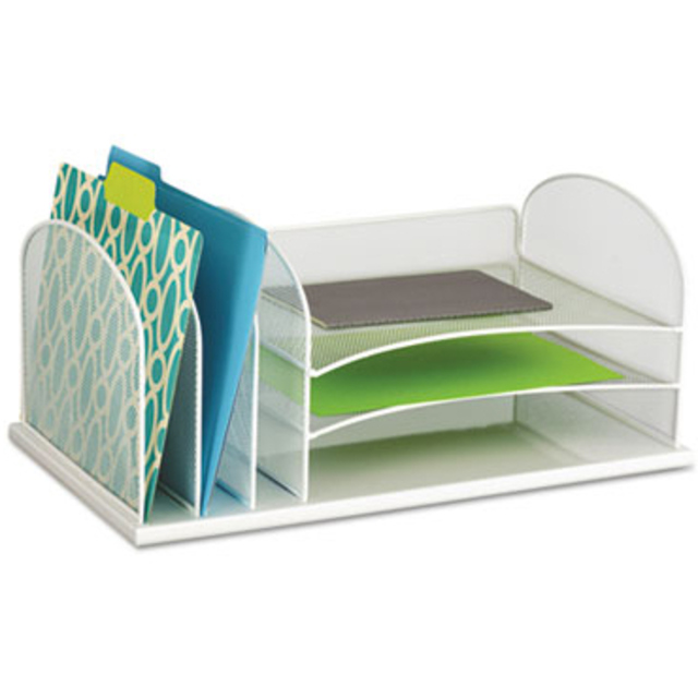 Space-saving design features six large-capacity 2" wide sections above and two letter size trays below. Use to organize file folders, binders, notepads and more. Steel mesh construction with powder coat finish for durability. Desktop File Folder Sorter Type: Inclined File Sorter; Number of Compartments: 8; Material(s): Steel Mesh; Width: 13 1/4".