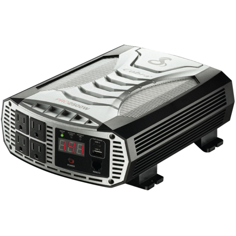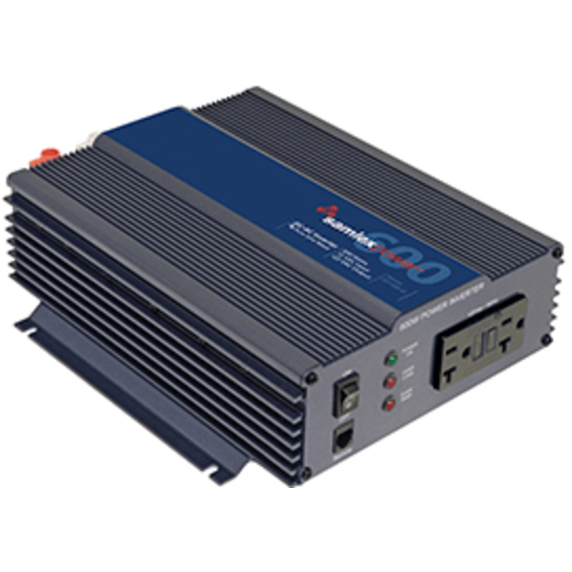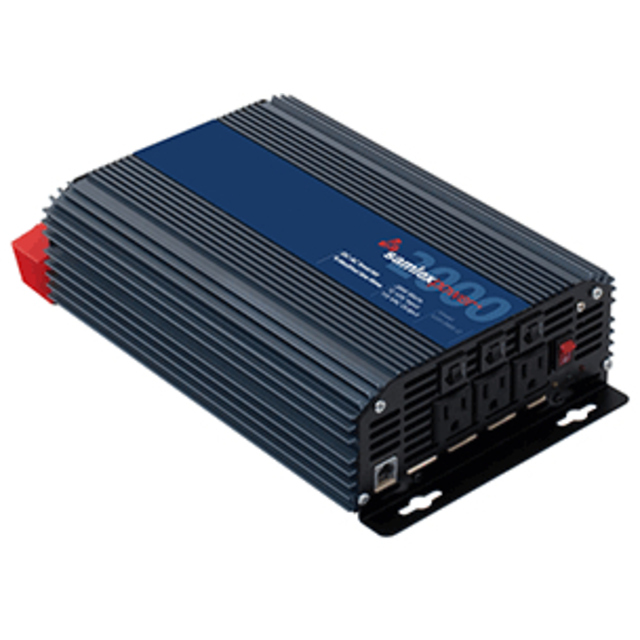This high efficiency DC-AC inverter converts 12 Volts DC to 300 Watts of pure sine-wave AC power at 120 Volts, 60 Hz. The unit comes with detachable cable with 12V plug adaptor and cable with battery clamps. Features include overload protection, low battery alarm / shut down, low idle power draw of less than 0.5 Amps. AC power is available from a NEMA-20R GFCI duplex outlet on the front panel. Safety certified to UL standards.