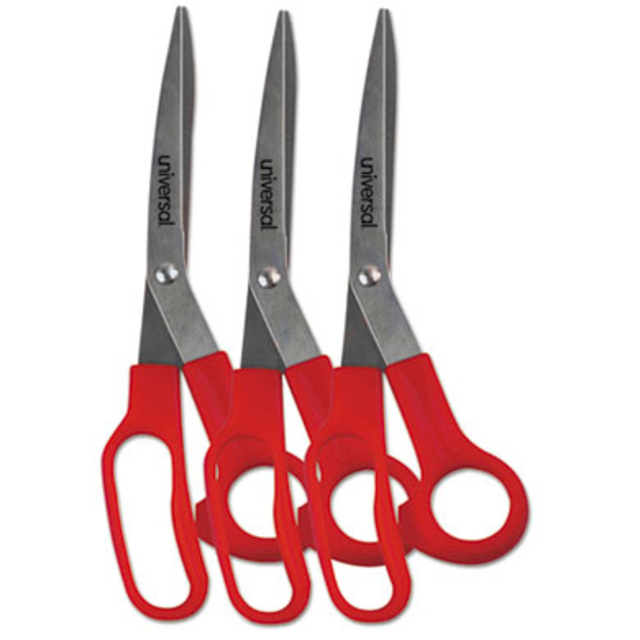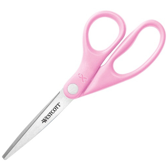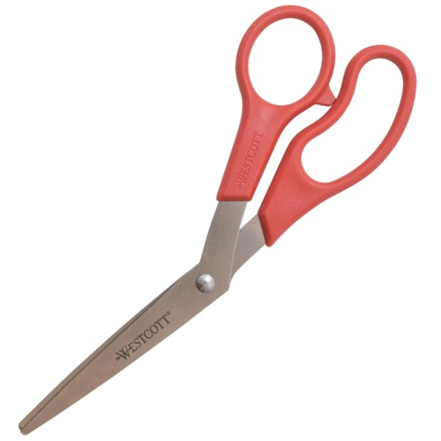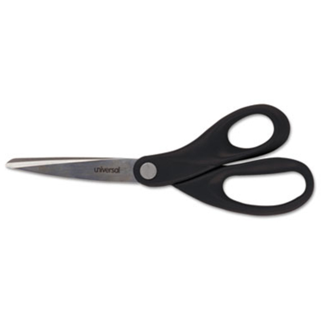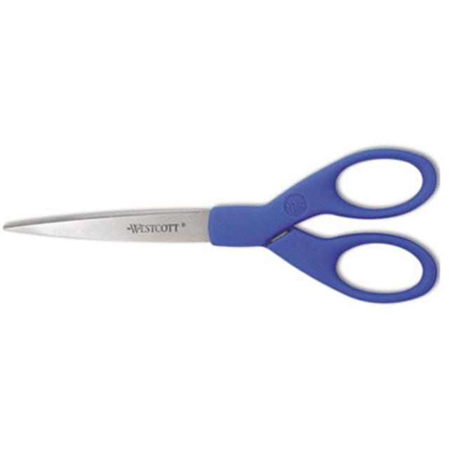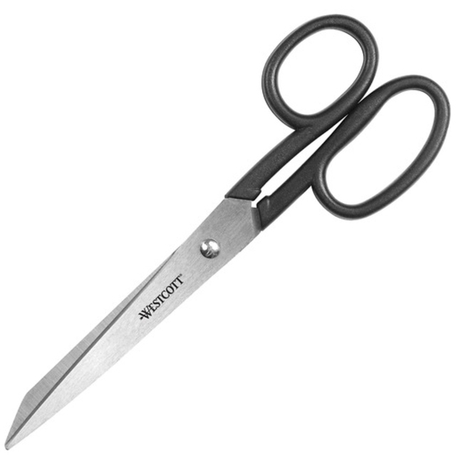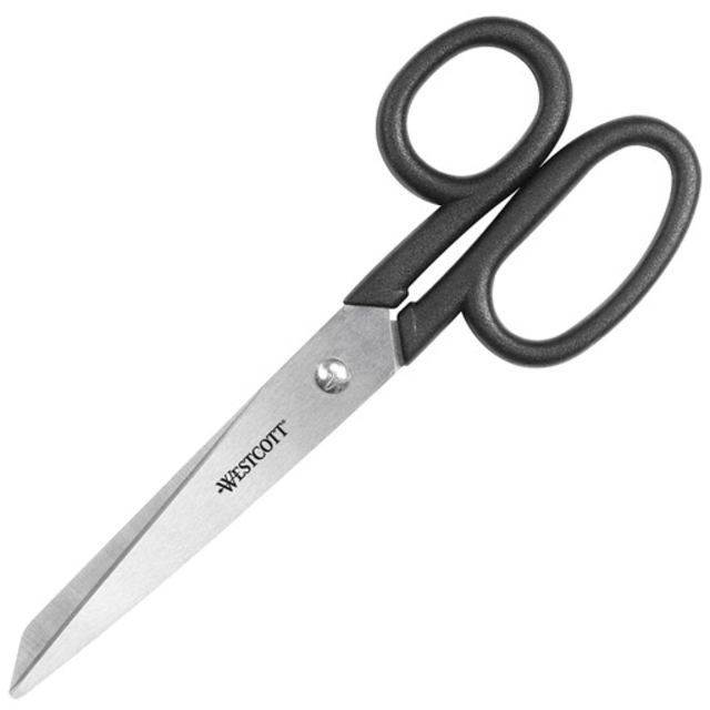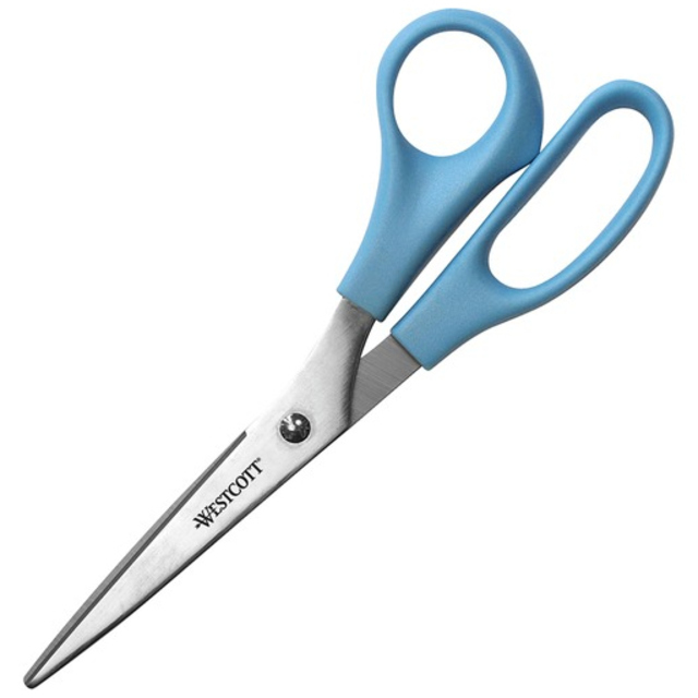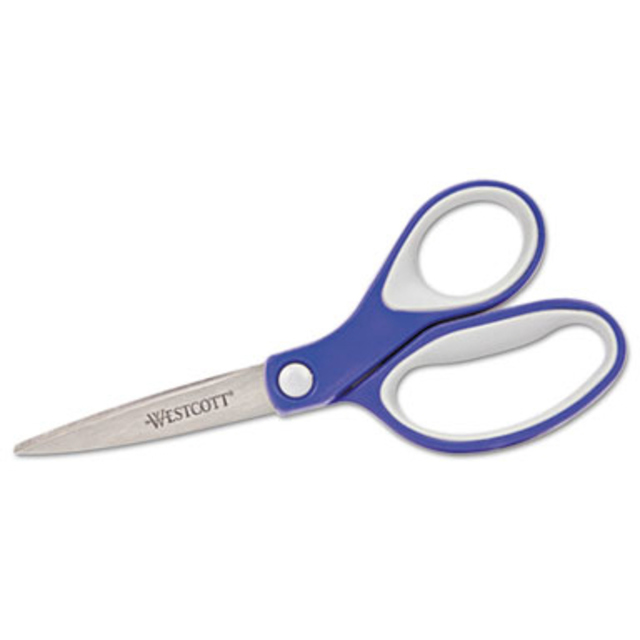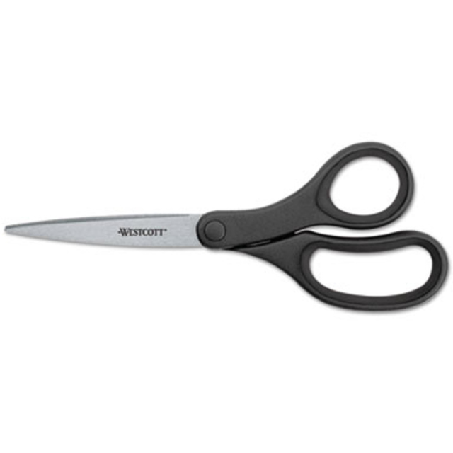 Titanium-coated steel for strength, durability and non-stick performance, these scissors are ideal even when working with double-sided tape and self-adhesive sheets. Innovative 3-D curved blades maintain sharpness and provide smooth, precise cuts each and every time. Ergonomic, soft-touch handles provide a more comfortable grip, enabling greater control. Gun-Metal Gray Blades. Cutting Tool Style: General Purpose; Tip Type: Pointed; Cut Length: 2.36\"; Overall Length: 5\".