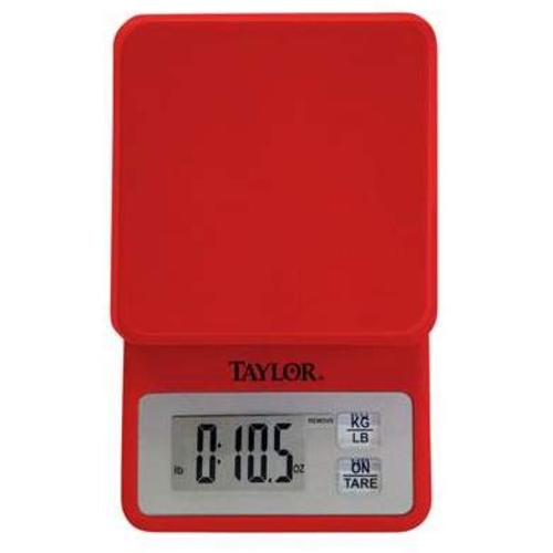 - Weighs in pounds/ounces or grams. - Reads in 0.1 oz and 1 g increments. - Capacity 11 lb / 5000 g. - Add & weigh tare function allows weighing of multiple ingredients in one bowl. - Can be used with variety of bowls/trays (not included). - 0.5" digits in a 0.7" readout. - Glass platform resists staining and food carry over. - Auto and manual shut off. - 2 AAA batteries included.