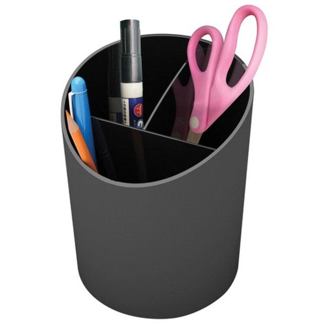 - Big cup divided pencil holder has three separate stepped compartments. - Extra-wide for generous storage space. - Three stepped compartments for easy access.